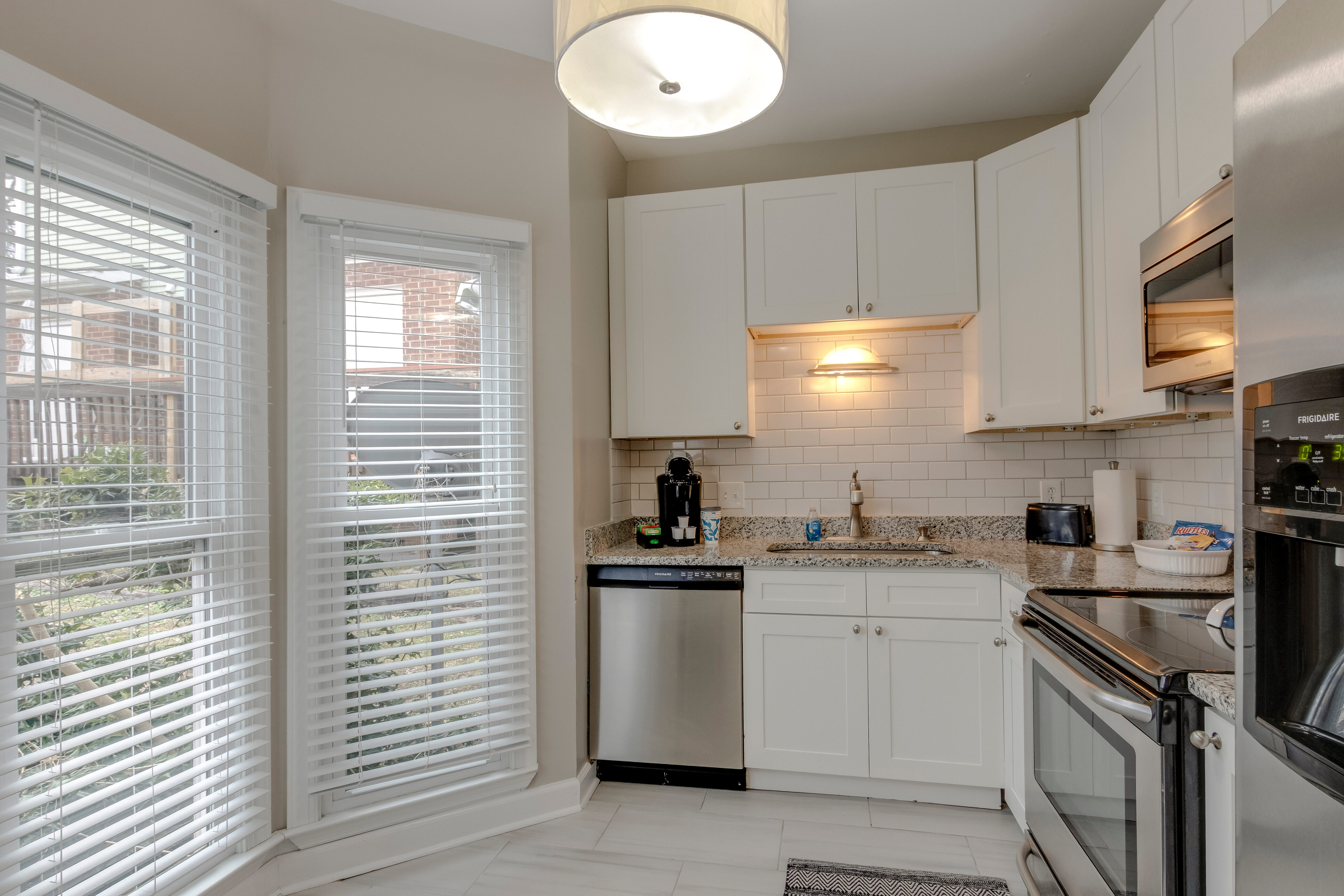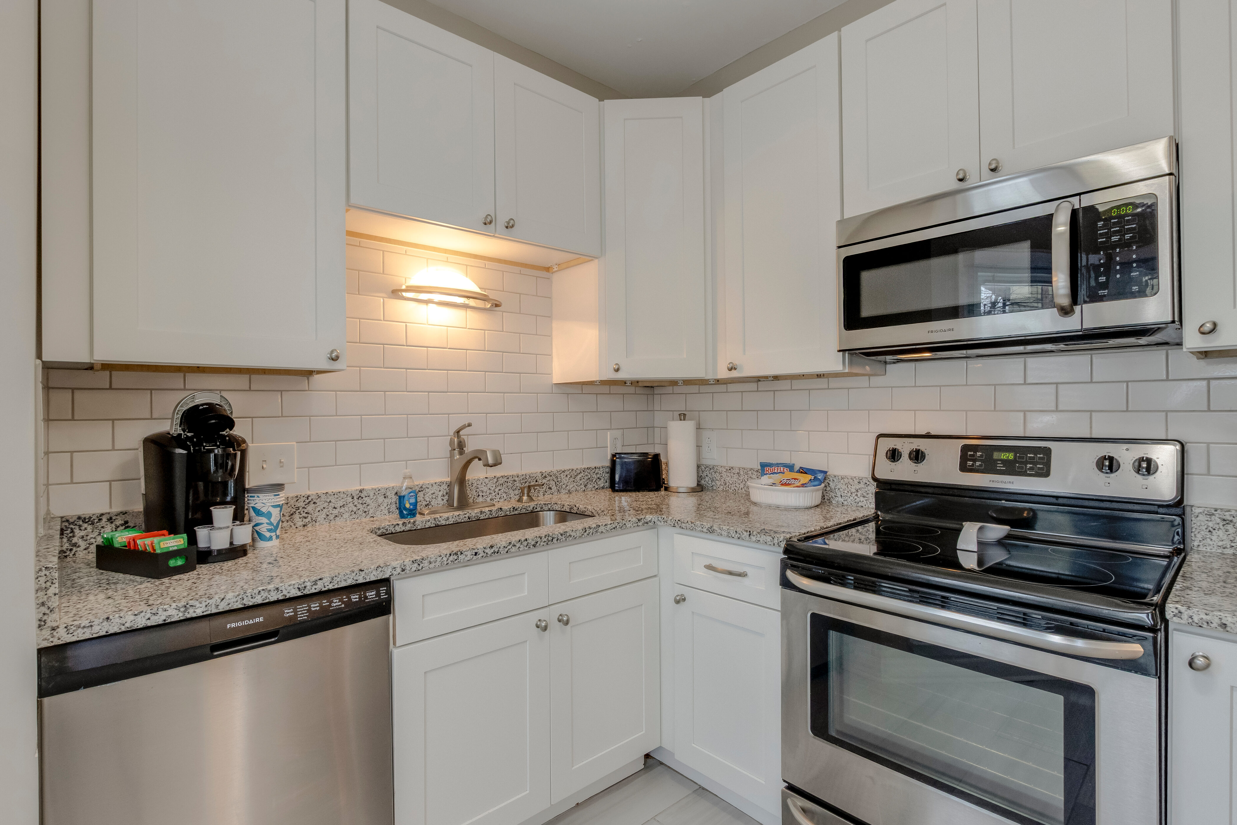 Our unit features a spacious living space, outfitted with clean minimalist furnishings and homey accent pieces that create a modern but welcoming unit. The full kitchen appointed with stainless steel appliances and a Keurig coffee maker mean that cooking for yourself is always an easy option. Eat or just hang out at the four seater high-top table. Enjoy downtime in the living room with its plush sectional sofa and flat screen Smart TV with local channels. Two private bedrooms complete with full en suite bathrooms provide everyone their own space to recuperate. Additional guests can snooze on the oversized couch in the living room which comfortably sleeps two and/or blow up the inflatable double bed - sheets and pillows are located in the unit to facilitate both of these sleeping solutions.
